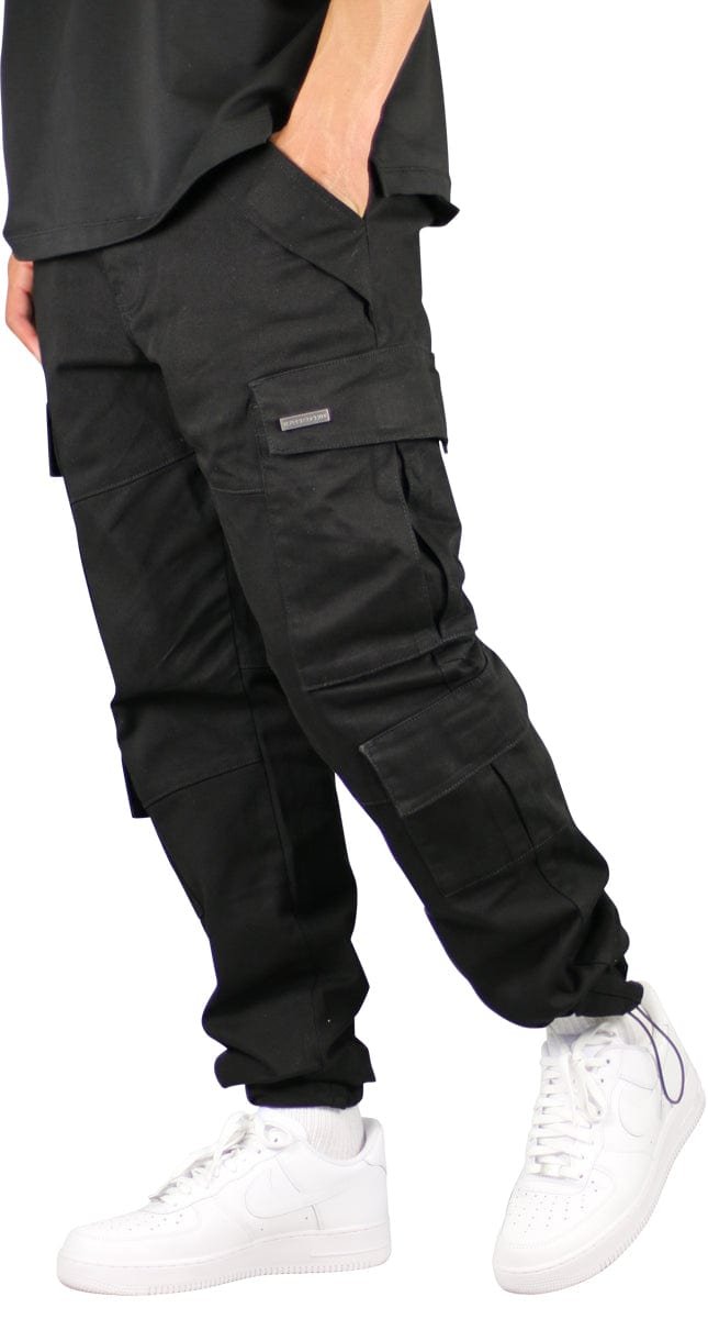 These cargo pants have an oversized fit, with a traditional jeans button and belt loops. Featuring 8 utility pockets and adjustable bungee cords at the ankles.