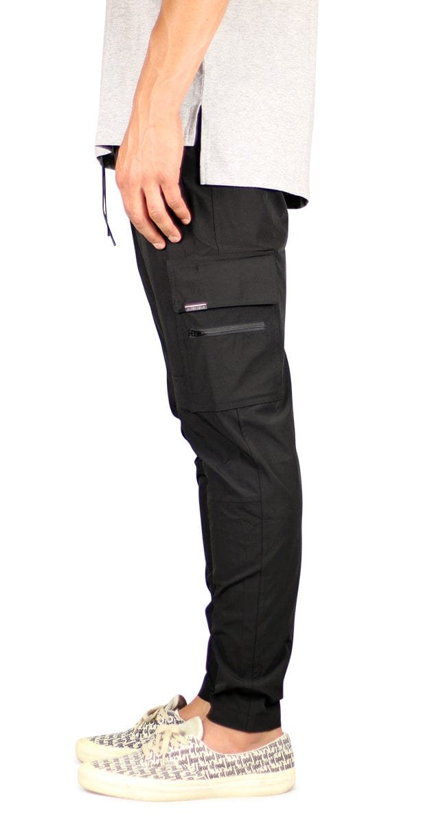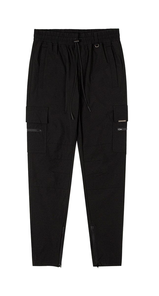 Crafted from ultra-lightweight, 4-way stretch nylon. These tapered zipper pants offer a comfortable fit with room in the hips and thighs, narrowing at the ankle. Perfect for any occasion, featuring cargo side pockets, an adjustable drawstring waistband, and a zippered hem for versatility in the S/S season.