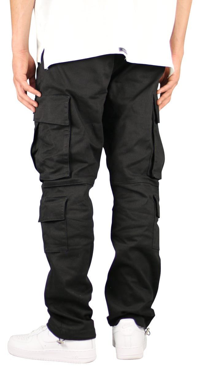 These cargo pants have an oversized fit, with a traditional jeans button and belt loops. Featuring 8 utility pockets and adjustable bungee cords at the ankles.